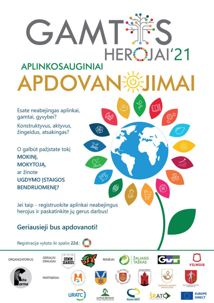 Visus neabejingus aplinkai, gamtai, gyvybei mokinius, mokytojus arugdymo įstaigų bendruomenes projekto „Gamtos herojai‘21“ organizatoriai kviečia teikti paraiškas į jau antrus metus iš eilės vykstančius apdovanojimus, kuriais siekiama ekologijos principus jaunajai kartai pradėti formuoti dar mokykloje.