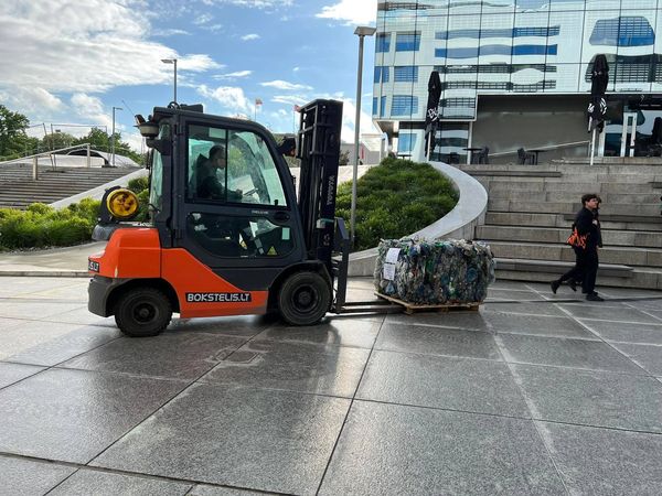 O šalia laiptų į V. Putvinskio g. pamatysite mūsų rūšiavimo produktą – suspausto PET plastiko ryšulį.